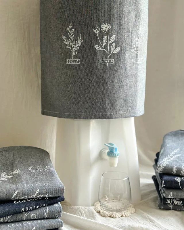 Nuestras fundas de bidón son ideales para cubrir el bidón de agua y darle un toque más lindo y armonioso a tu cocina, comedor o espacio de trabajo.