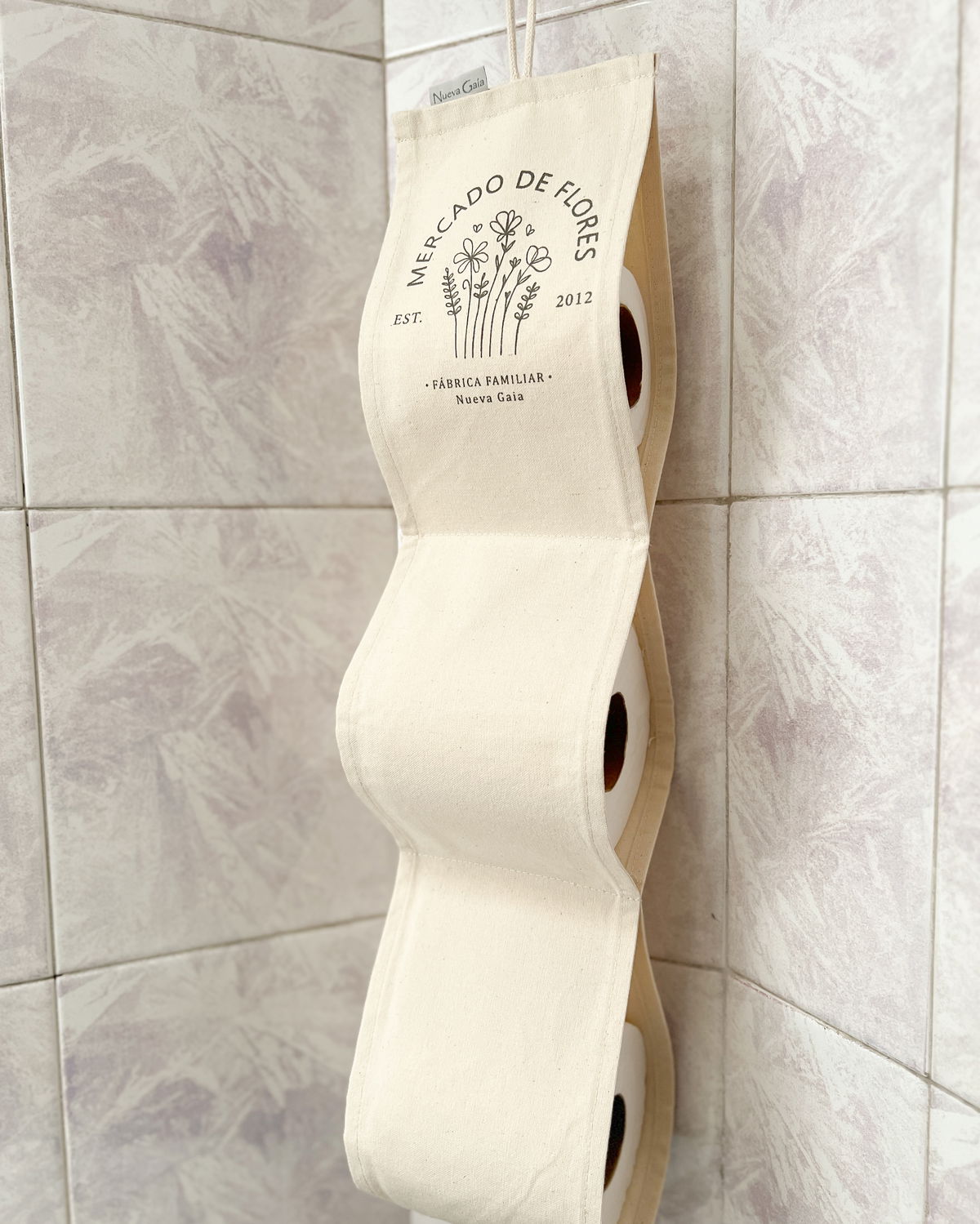 Podés colgarlo de la pared, toallero o picaporte, y tener rollos extra siempre listos y prolijos.