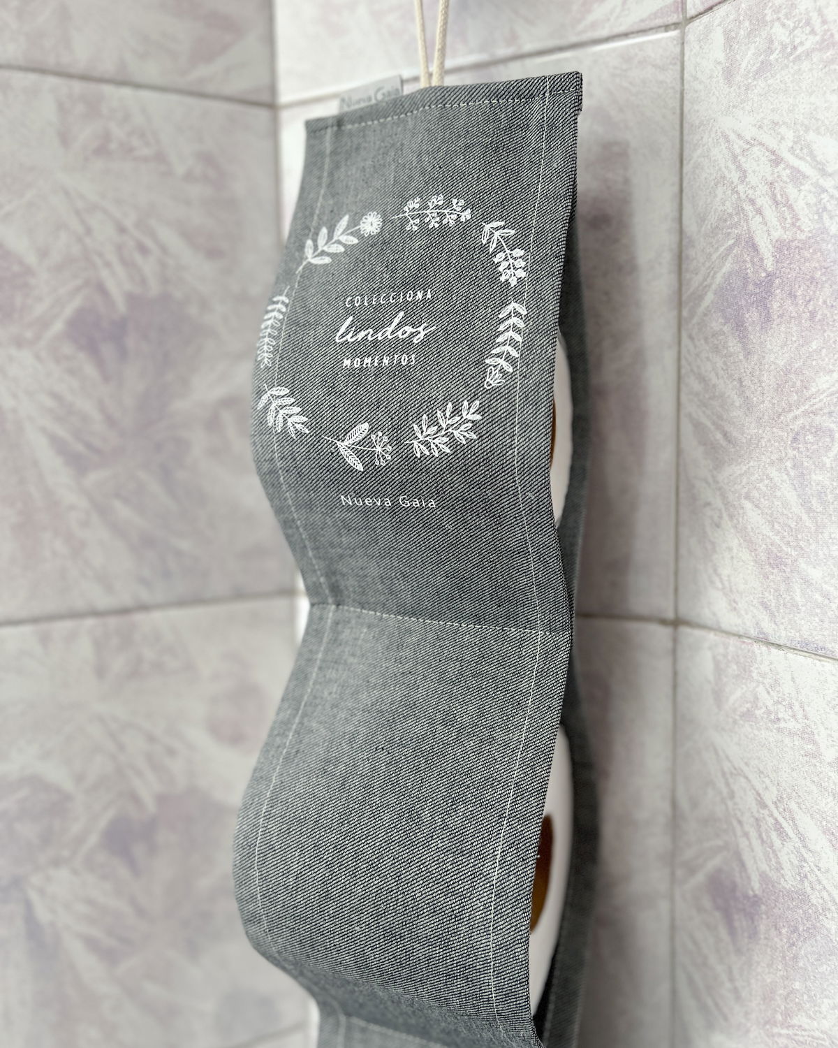 Podés colgarlo de la pared, toallero o picaporte, y tener rollos extra siempre listos y prolijos.