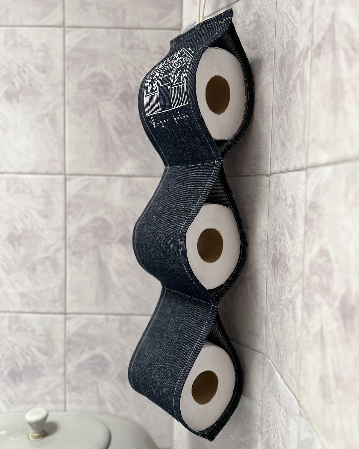 Podés colgarlo de la pared, toallero o picaporte, y tener rollos extra siempre listos y prolijos.
