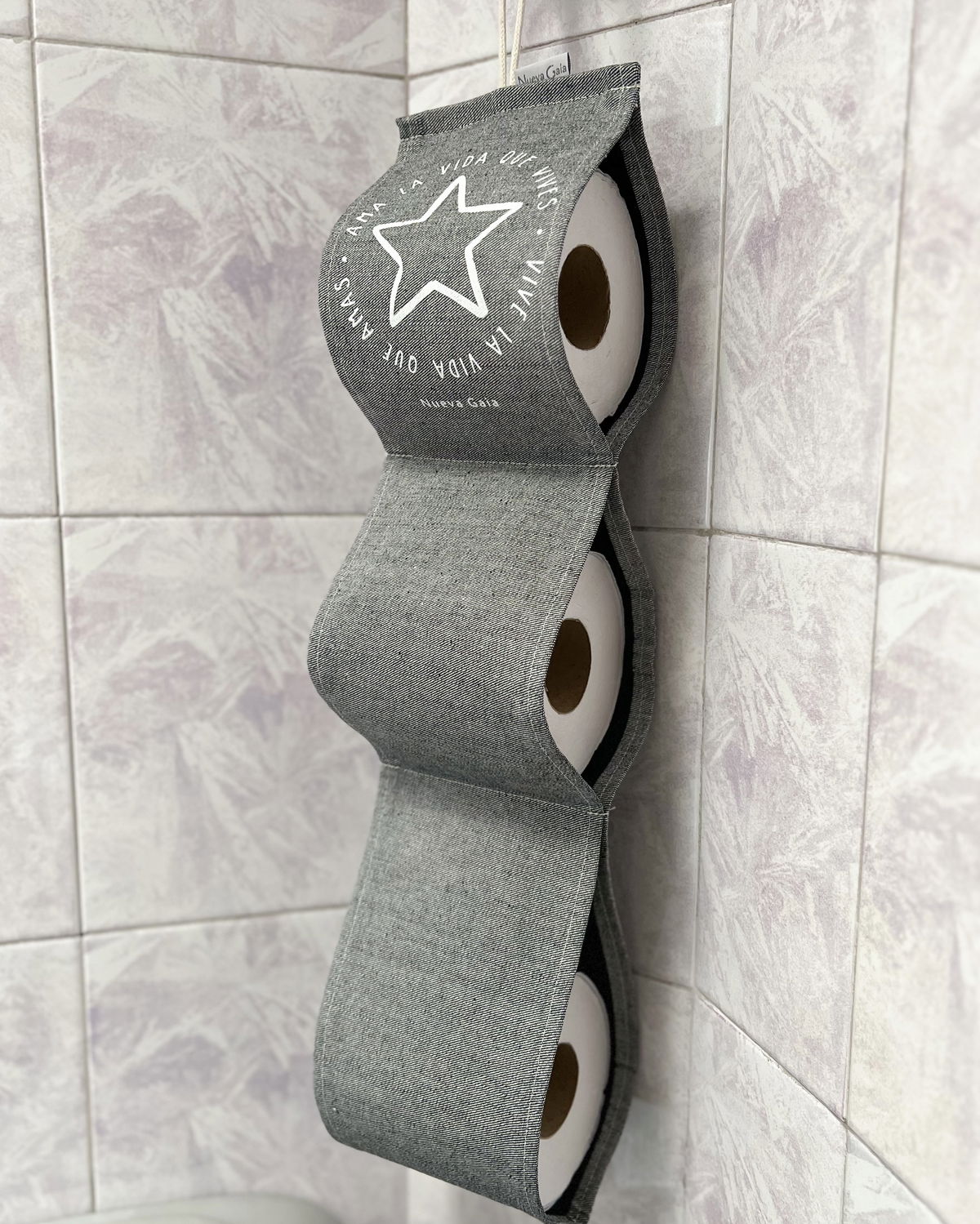 Podés colgarlo de la pared, toallero o picaporte, y tener rollos extra siempre listos y prolijos.